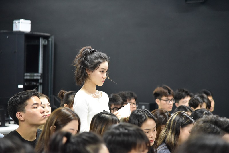 讲座的氛围井然有序而又不失灵动朝气,同学们踊跃地提出问题,在舞台上付诸实践、用心感受、找出问题、不断分析,展现了表演系独有的课堂魅力。活跃的气氛之中,庄嘉敏导演随性朗诵一段“将进酒”,与同学们展开思维碰撞。