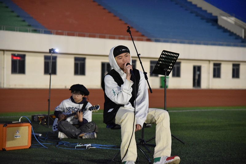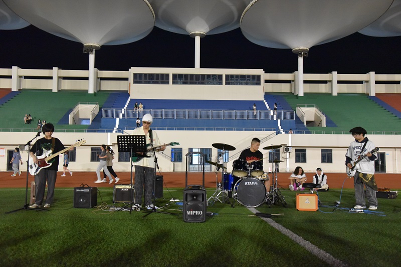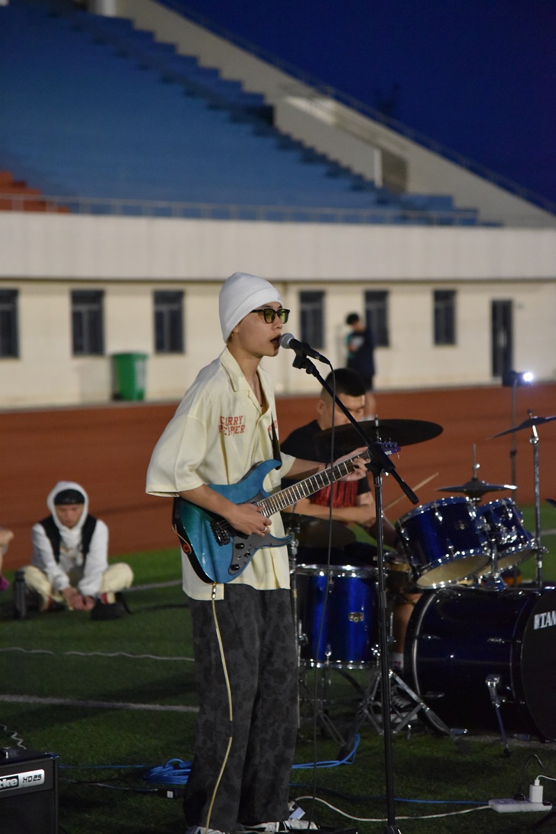 音乐202班的曹松博是乐队主唱,也是草坪音乐会的发起者。在户外练习弹唱时,他发现时常有路过的师生驻足聆听,享受音乐。“或许可以办一场草坪音乐会,让更多人听到自己的歌声。”在征得校区和学院的支持后,他与五名志趣相同的同学组成乐队,经过紧锣密鼓的筹备,草坪音乐会闪亮登场。