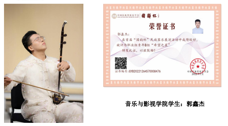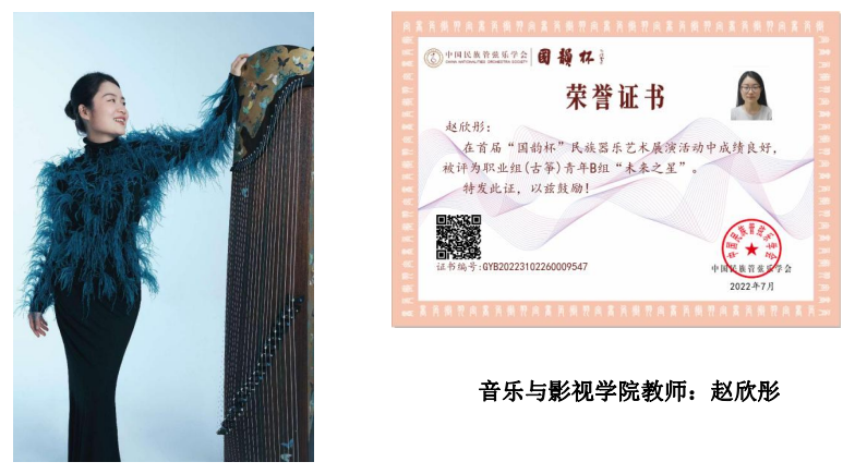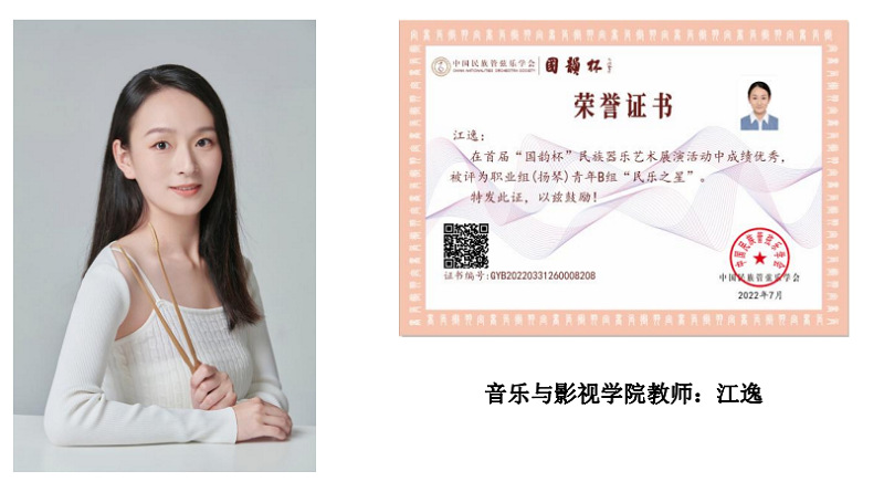 avbebe 音乐与影视学院音乐系师生积极备赛,紧锣密鼓地进行参赛作品录制。经过激烈角逐,最终我校师生喜获六项国家级奖项。其中,周墨涵、江逸两位老师获得职业组青年B组“民乐之星”,并入选“中国民族管弦乐学会优秀民乐人才扶持计划”;赵欣彤、朱淑琦两位老师获得职业组青年B组“未来之星”;18级学生郭鑫杰、21级学生黄梓涵获得职业组青年B组“希望之星”