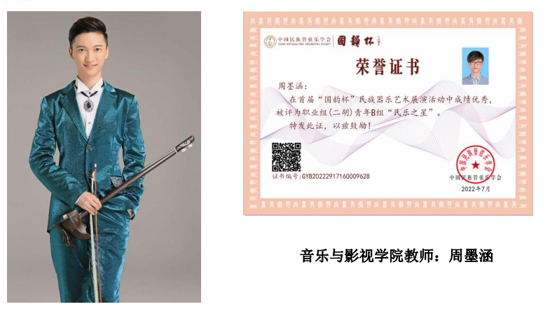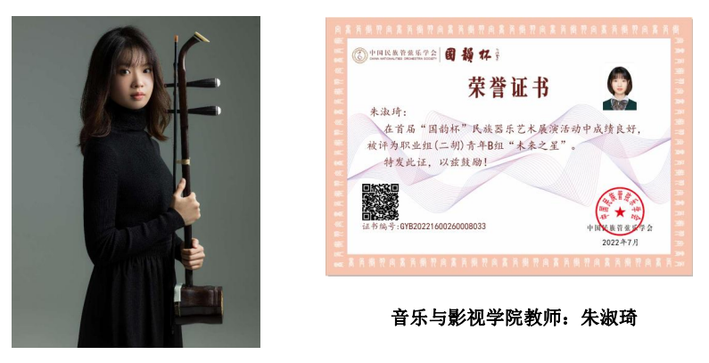 avbebe 音乐与影视学院音乐系师生积极备赛,紧锣密鼓地进行参赛作品录制。经过激烈角逐,最终我校师生喜获六项国家级奖项。其中,周墨涵、江逸两位老师获得职业组青年B组“民乐之星”,并入选“中国民族管弦乐学会优秀民乐人才扶持计划”;赵欣彤、朱淑琦两位老师获得职业组青年B组“未来之星”;18级学生郭鑫杰、21级学生黄梓涵获得职业组青年B组“希望之星”