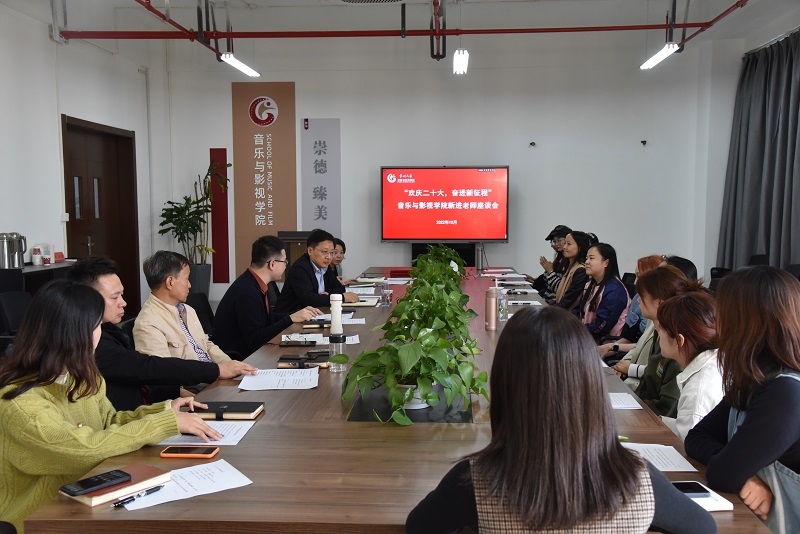 欢庆二十大,奋进新征程。为展示新时代伟大成就,凝聚新征程奋进伟力,以实际行动欢庆党的二十大胜利召开,同时也为欢迎新教师,帮助新教师尽快转变角色、融入音乐与影视学院大家庭,10月19日下午,学院在立行楼442会议室举办了2022年新引进教师座谈会。校关工委副主任袁能老师、学院党政领导班子、新教师及教师代表参加此次会议,会议由副院长赵一兆主持。