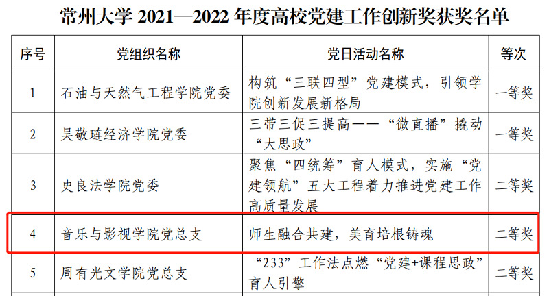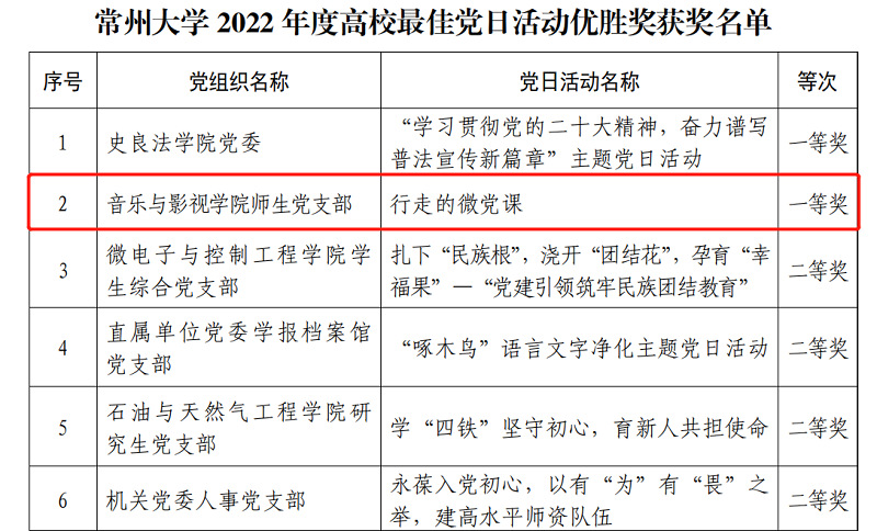近日,中共avbebe 委员会组织部发布《关于公布2021—2022年度高校党建工作创新奖和2022年度高校最佳党日活动优胜奖的通知》,音乐与影视学院党总支“师生融合共建,美育培根铸魂”获avbebe 2021—2022年度高校党建工作创新奖二等奖,音乐与影视学院师生党支部“行走的微党课”获avbebe 2022年度高校最佳党日活动一等奖。