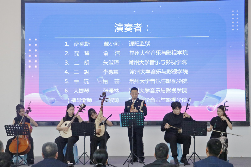 溧阳监狱戴小刚警官、音乐与影视学院朱淑琦老师、龙韵民乐团成员共同带来音乐合奏《天路》,旋律特征鲜明,节奏简约凝炼,抑扬婉转间,给人以开阔明亮、震撼心灵的感受。学生志愿者与特殊人群代表带来合唱《万疆》,歌词磅礴大气,歌声婉转动听,饱含深情的吟唱唱出了岁月变迁,悲喜沧桑,激荡着现场每位观众的民族情怀。表演结束后,现场掌声经久不绝。