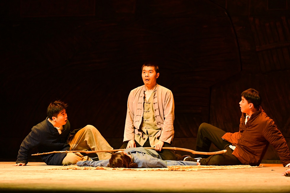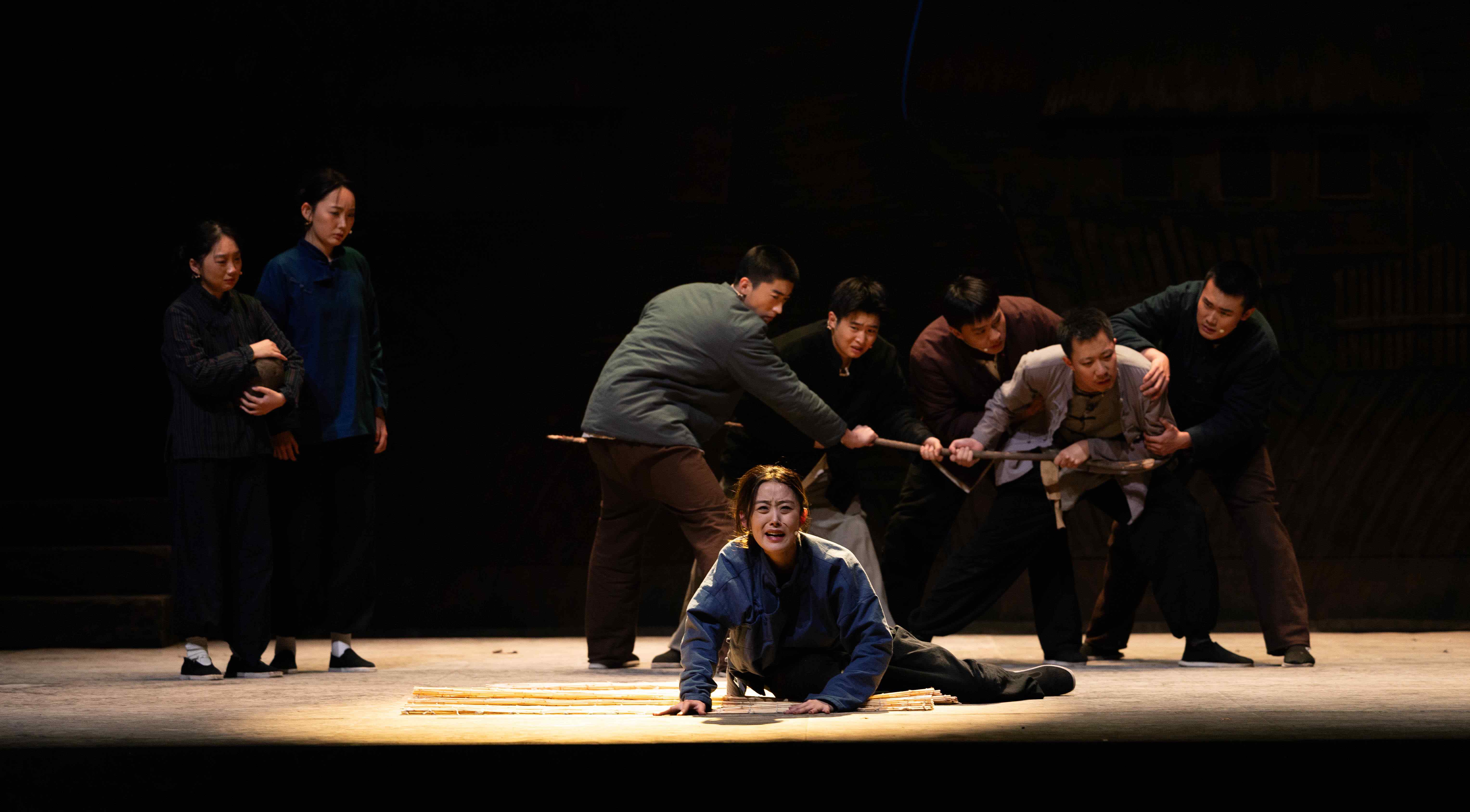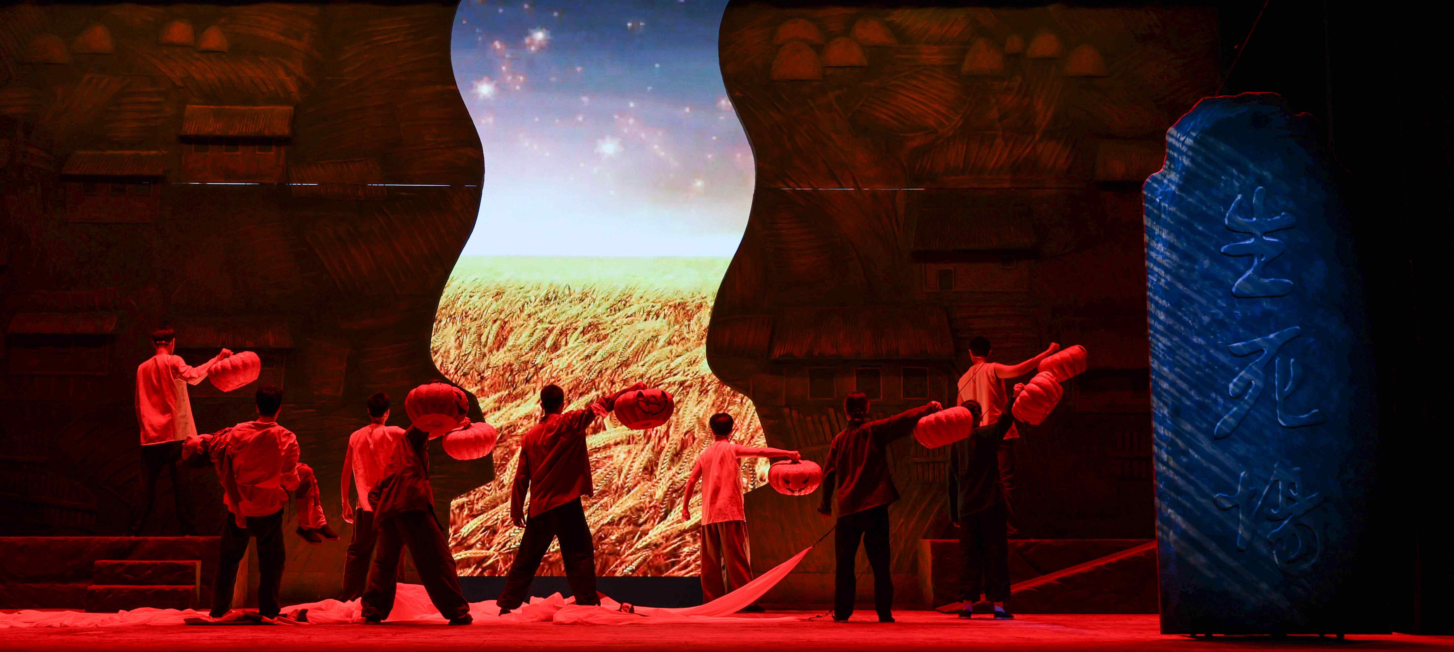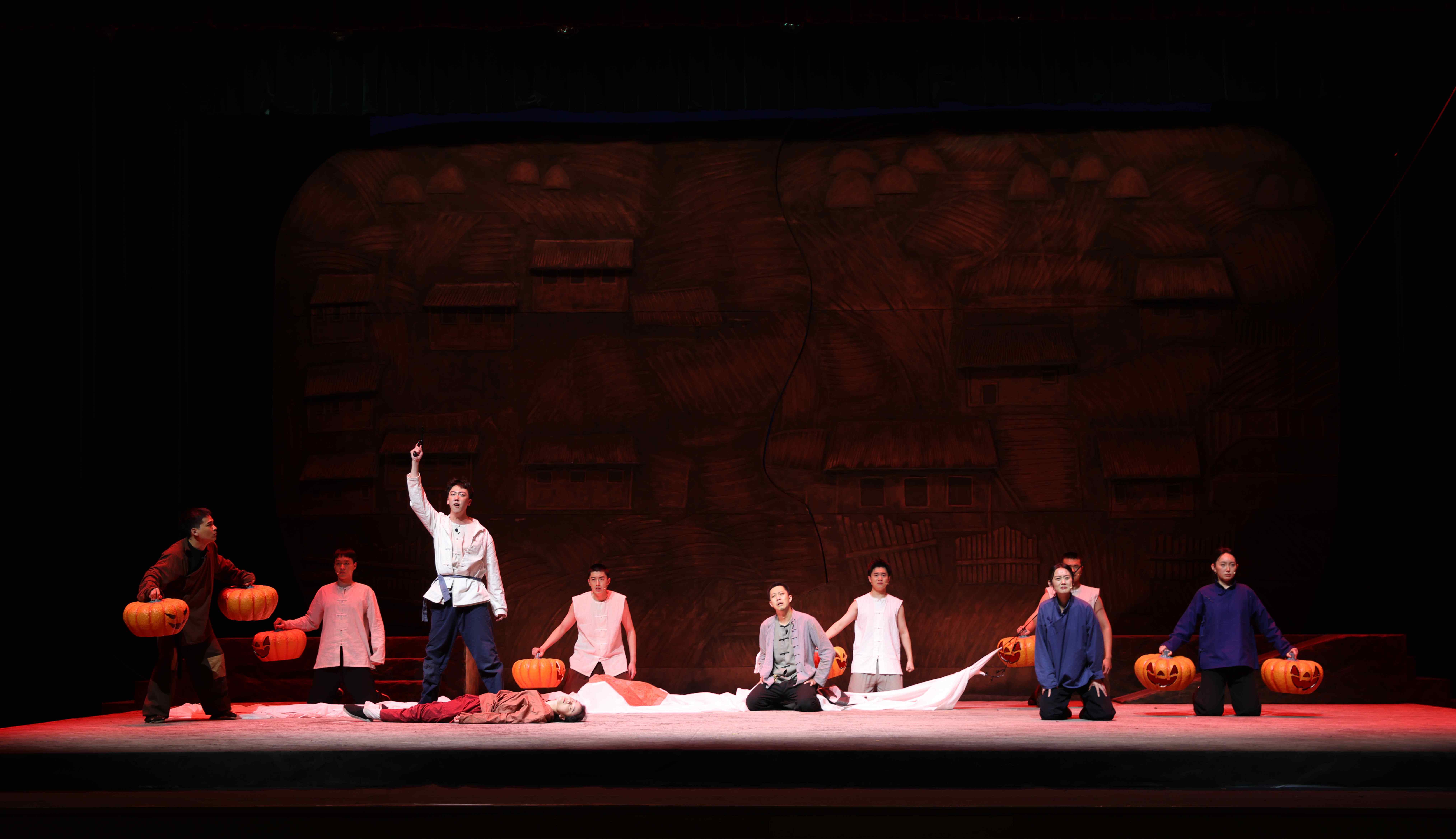 话剧版《生死场》改编自萧红先生的同名小说,讲述了九一八事变后哈尔滨近邻一个村庄的村民“生”与“死”的故事,它以民族意识觉醒之名,以反抗与斗争之名,阐释生与死的真实含义,反映了在遭受外来侵害时东北农民悲惨的生活状态以及逐渐苏醒的民族意识和反抗精神,让20世纪初的中国人蜕去在千年如一日的僵死乡村里风化的丑陋硬壳,使灵魂得以阔步,血性得以爆发,生命得以酣畅淋漓地呼喊。该剧的人物语言、戏剧风格更为写实,关于女性力量的叙述虽然隐晦但力量巨大。剧中人物个性鲜明、语言生动,胆子大的赵三、渴望挺直腰板儿的二里半、思想先进的王婆子,人物的成长与觉醒与其身份的极大反差感,呈现出一种独特又强大的影响力。该剧运用蒙太奇的手法,配合光与影,追求一种朴拙、雄浑、悲壮的美,在简洁的舞台上,一个个背负着苦难的生灵迈开生命的步伐,一盏盏悠悠亮起的南瓜灯,在黑暗中讲述着无尽的意蕴,引人深思。剧情采用非线性叙事方式,不同场景的切换衔接有序,一气呵成,形成强烈的舞台冲击力。剧中浓烈和悲怆的基调表达,已然不是这个时代的节拍,但依然能引起强大的共鸣,深深触动着每个人的心弦。在场观众被跌宕起伏的剧情和演员们的精彩演绎深深打动,所有人的民族情感在这一刻汇聚并共同燃烧,演出气氛相当热烈。师生们纷纷表示,整场演出感人至深,剧情震撼人心,演出结束后大家的心情久久不能平静。