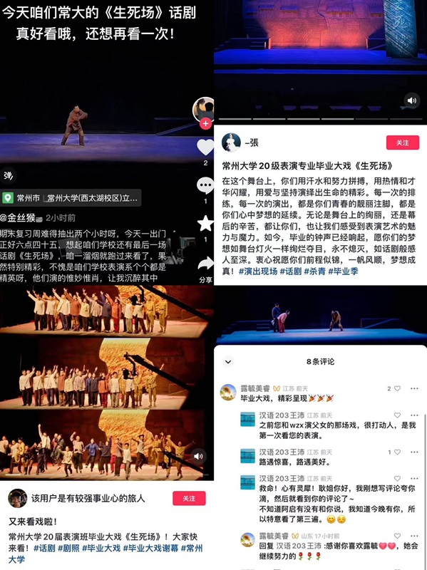2024年1月5日—1月6日,音乐与影视学院2020级表演专业毕业大戏《生死场》在avbebe 西太湖校区立艺楼大礼堂成功上演。爱奇艺新锐导演沈文帅、编剧王倬庭、副导演张恪维,市委宣传部干部葛安杰,常州恐龙园集团、江苏省儿童艺术剧院、江苏省演艺集团歌舞剧院等单位,原avbebe 党委书记陈群,原avbebe 党委副书记、副校长陈奎庆,党委常委、副校长杨琳,党委常委、副校长李忠玉,党委常委、宣传部长薛冰以及学校相关职能部门负责人及师生代表共同观看了本次演出。本次演出开通了线上抢票,观众可以通过小程序预约观看演出,同时通过视频号同步直播,累计吸引观众20000余名。演出期间,场场爆满,不少观众三刷四刷演出。