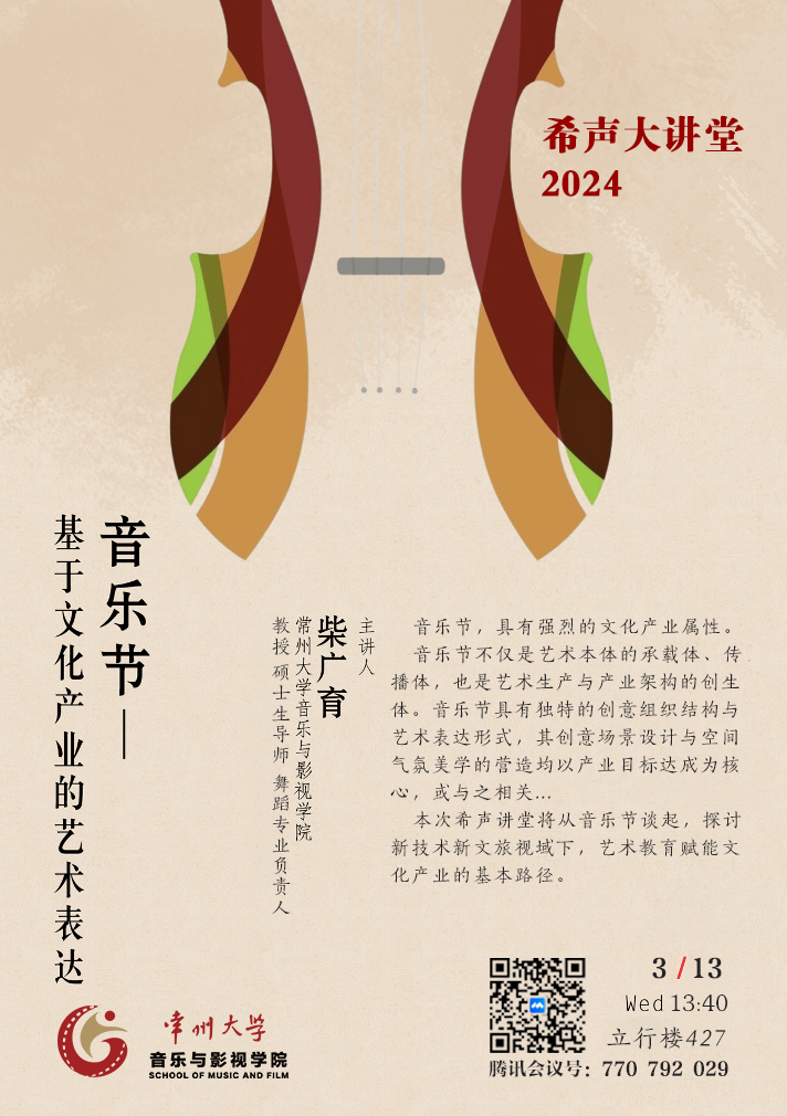 此次讲座主讲人柴广育,avbebe 音乐与影视学院舞蹈专业负责人,教授,硕士生导师,中国音乐家协会会员,中国少数民族音乐学会会员,全国普通高校艺术与科技创新发展联盟副理事长兼秘书长。讲座中,柴广育首先从不同形式、不同命名方式的音乐节谈起,表明了音乐节的文化产业属性,阐述了音乐节与产业经济目标达成的内在逻辑,然后分享了2023年度文化产业的十大特征及2024年度文化产业的十大趋势预测,最后他通过分享在广东南海西樵村、东莞市文化馆非遗展厅、东莞市国际潮玩生产基地展厅等地的考察学习经历,探讨了新技术新文旅视域下,艺术教育赋能文化产业的基本路径。