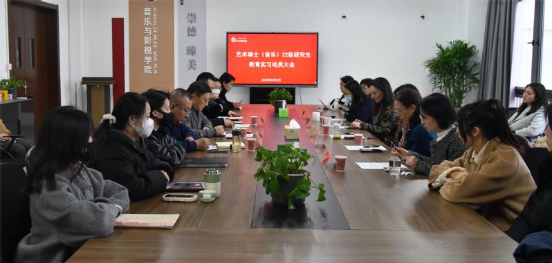 3月25日下午,音乐与影视学院在立行楼442会议室召开艺术硕士(音乐)22级研究生教育实习动员大会,会议邀请常州市丽华新村第三小学书记、校长、江苏省中小学特级音乐教师蒋忱,常州市教育科学研究院音乐教研员、常州市中学高级音乐教师王明霞,常州市武进区学校和教师发展中心音乐教研员、常州市中学高级音乐教师李珊珊三位行业导师。院长熊祖鹏、副院长王成文、全体音乐教育方向研究生校内导师及艺术硕士(音乐)22级、23级音乐教育方向研究生参加会议。会议由副院长王成文主持。
