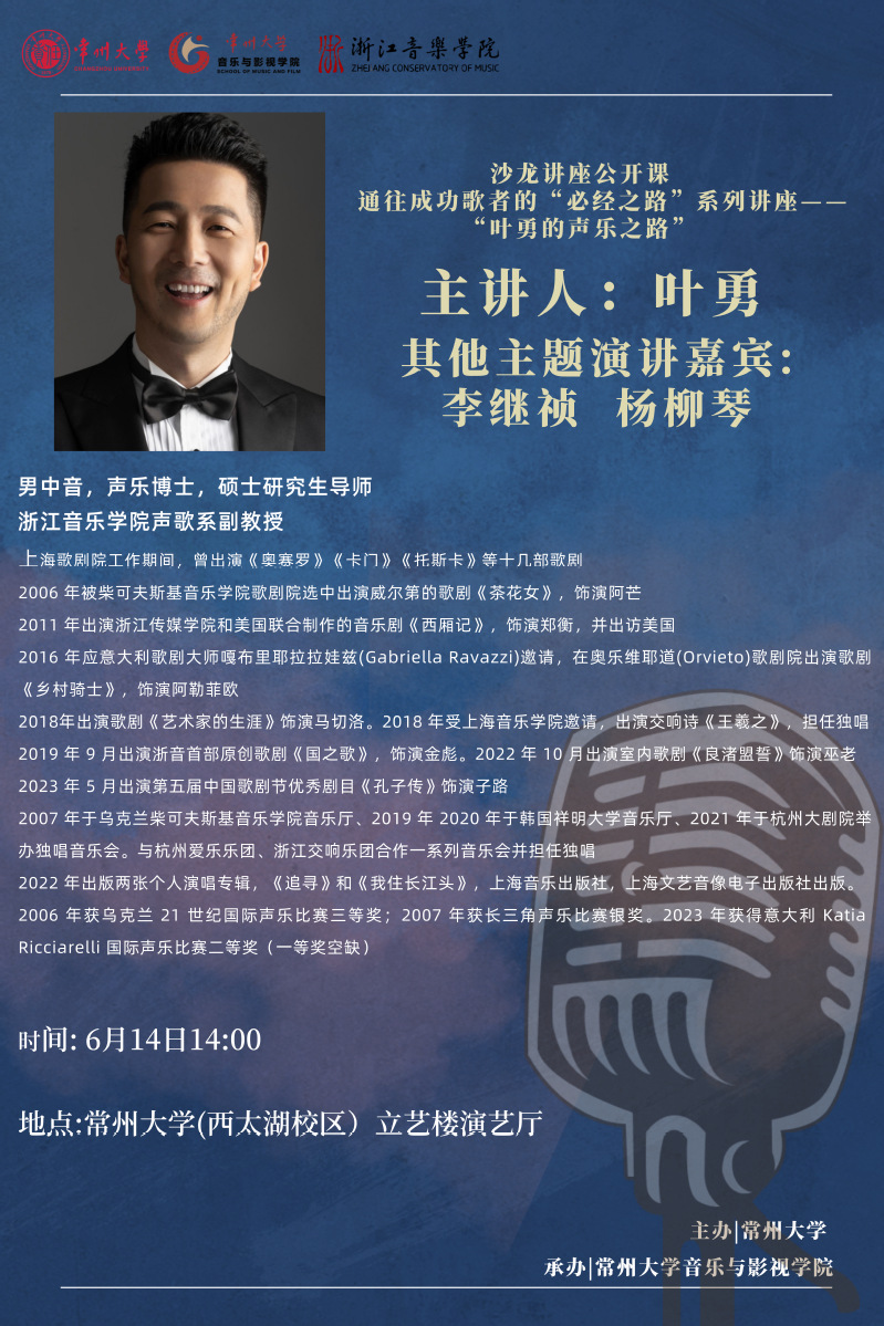 614下午,音乐与影视学院开展“通往成功歌者的必经之路”系列沙龙讲座第一讲----“叶勇的声乐之路”浙江音乐学院声歌系硕士生导师、青年男中音歌唱家叶勇教授应邀来我开展沙龙讲座暨公开课。音乐与影视学院领导班子、声乐教研室全体教师和声乐主项学生参加此次讲座。