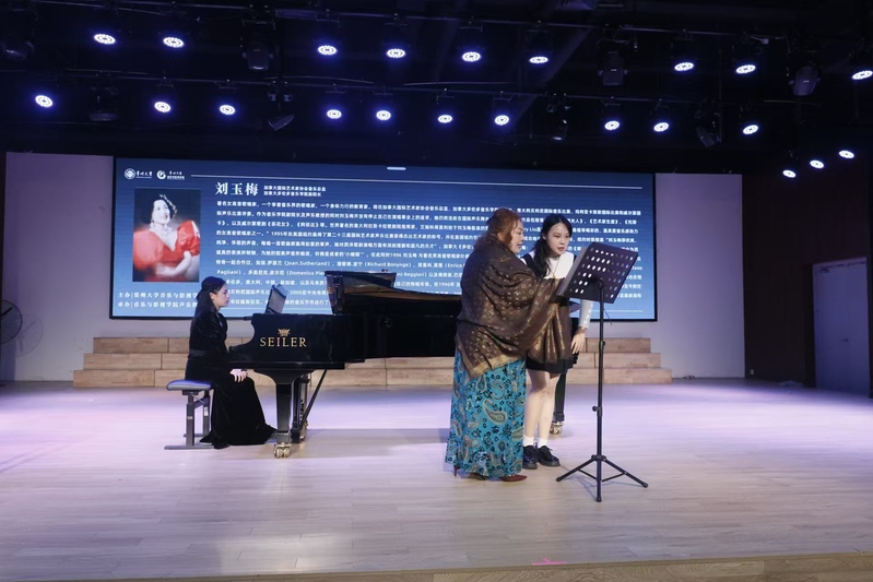 在西太湖校区立艺楼演艺厅,刘玉梅与现场师生分享了他多年来的声乐教学经验。她通过现场示范和讲解,帮助师生更好地理解和掌握声乐演唱的技术要点和声乐作品的处理细节。针对声乐专业四名学生的现场展示,刘玉梅分别在声音、语言、情感、舞台表演等方面对学生进行了一对一专业指导,他勉励同学们既要沉得下心刻苦练习,更要重视在舞台上的实践机会,不断上台打磨锻炼,才能真正提高自身演唱水平。讲座过程中,刘玉梅教授还与现场师生进行了互动交流,回答了他们在学习和实践中遇到的问题。