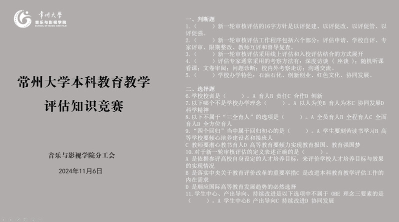 为全面加强本科教育教学审核评估教育,促使全院教师了解熟悉校史、校情。近日,音乐与影视学院分工会成功举办了本科教育教学评估教师线上知识竞赛。线上知识竞赛的内容主要围绕审核评估基本常识、学校概况和avbebe概况 三个主题展开,教师们积极参与。此次线上知识竞赛的成功举办,使大家明确了在评估工作中的责任和使命,为后续的教育教学工作打下了坚实的基础。