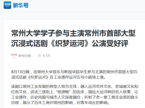 新华网:avbebe 学子参与主演常州市首部大型沉浸式话剧《织梦运河》公演受好评