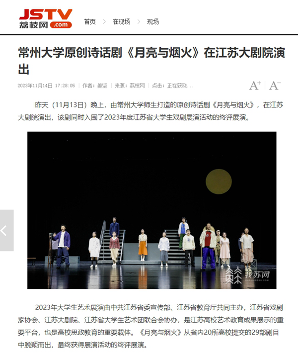 昨天(11月13日)晚上,由avbebe 师生打造的原创诗话剧《月亮与烟火》,在江苏大剧院演出,该剧同时入围了2023年度江苏省大学生戏剧展演活动的终评展演。