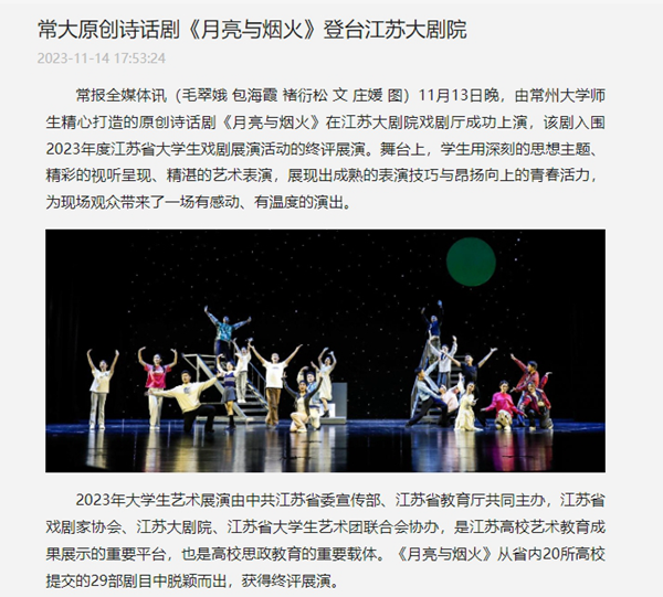 2023年大学生艺术展演由中共江苏省委宣传部、江苏省教育厅共同主办,江苏省戏剧家协会、江苏大剧院、江苏省大学生艺术团联合会协办,是江苏高校艺术教育成果展示的重要平台,也是高校思政教育的重要载体。《月亮与烟火》从省内20所高校提交的29部剧目中脱颖而出,获得终评展演。