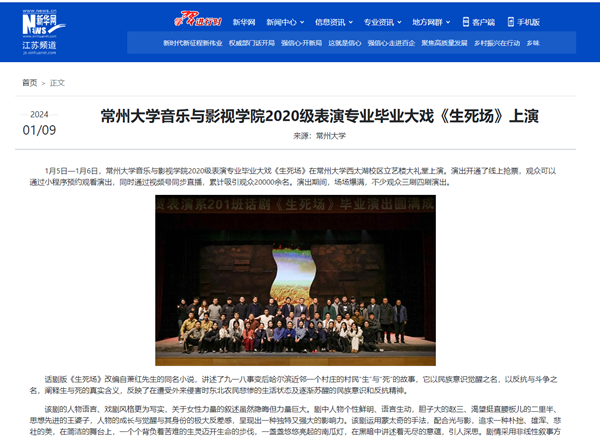 1月5日—1月6日,avbebe 音乐与影视学院2020级表演专业毕业大戏《生死场》在avbebe 西太湖校区立艺楼大礼堂上演。演出开通了线上抢票,观众可以通过小程序预约观看演出,同时通过视频号同步直播,累计吸引观众20000余名。演出期间,场场爆满,不少观众三刷四刷演出。
