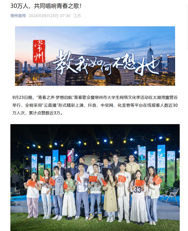 9月23日晚,“青春之声·梦想启航”青春歌会暨常州市大学生网络文化季活动在太湖湾露营谷举行,全程采用“云直播”形式精彩上演,抖音、中吴网、化龙巷等平台在线观看人数近30万人次,累计点赞数近3万。
