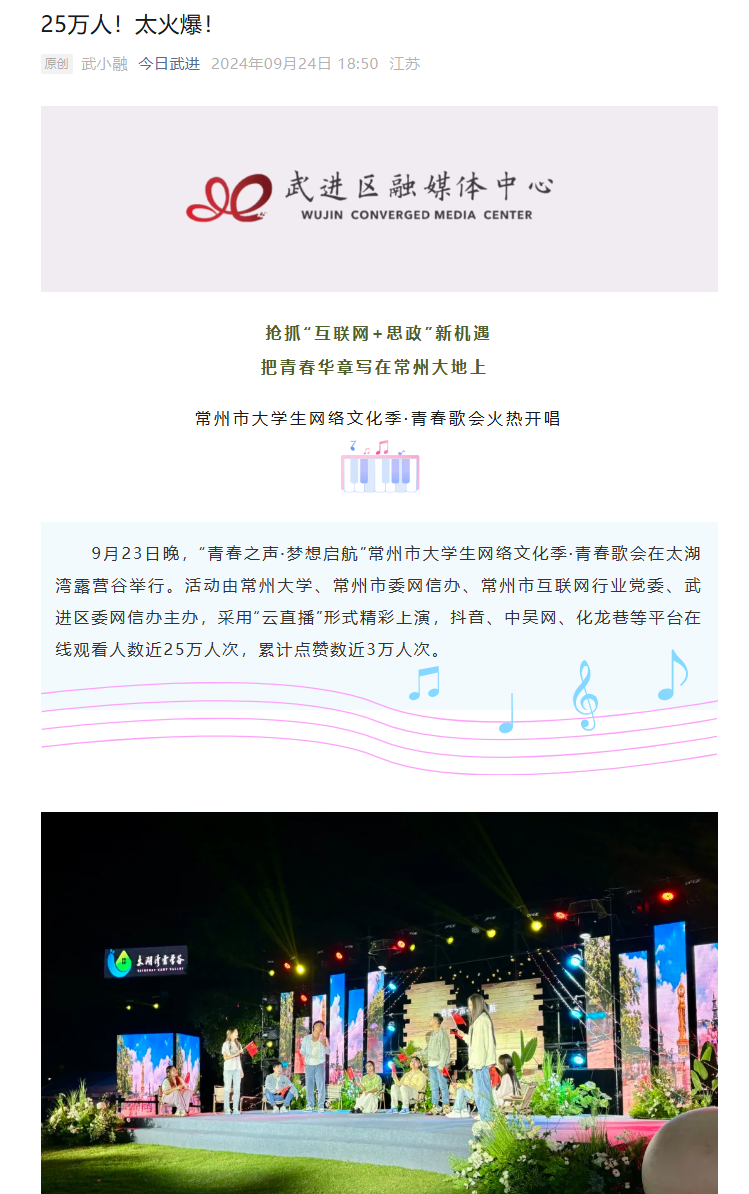 、常州市委网信办、常州市互联网行业党委、武进区委网信办主办,采用“云直播”形式精彩上演,抖音、中吴网、化龙巷等平台在线观看人数近25万人次,累计点赞数近3万人次。