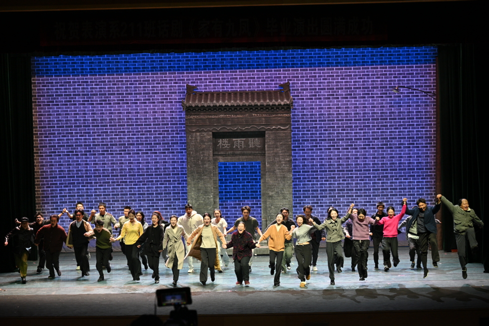 毕业大戏《家有九凤》根据作家高满堂同名小说改编,由表演211班全体同学参与演出。该剧用发生在普通家庭中的平凡小事,从侧面表现出了这个时代所具有的特征。主要讲述了听雨楼里初家老太太含辛茹苦拉扯着九个女儿,从文革末期到改革开放,一个普通家庭近二十年间的真实生活状况和心路历程。全剧除了温馨感人的亲情之外,时代的变迁也被融入其中。