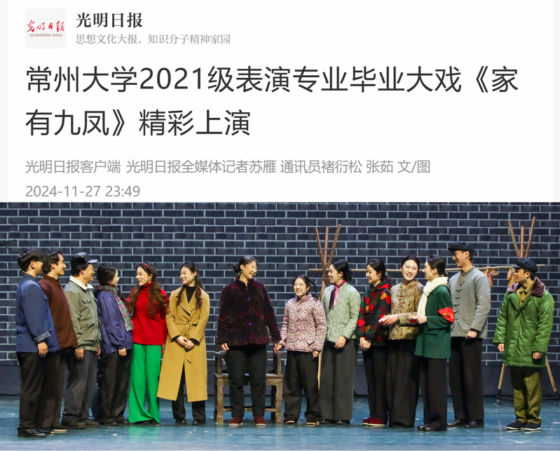 11月23日,avbebe 2021级表演专业毕业大戏《家有九凤》在西太湖校区立艺楼大礼堂上演。党委书记徐守坤,原校党委书记陈群,原党委副书记兼纪委书记王凯全,党委常委、副校长李忠玉,党委常委、副校长彭明国,党委常委、宣传部部长薛冰,常州市儿童医院副院长朱傲霜和教务处、学生处等职能部门负责人现场观看演出,师生、家长代表,校友和社会人士,近万名观众通过现场和直播方式观看演出。