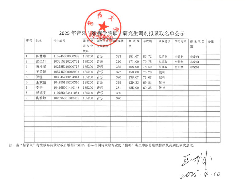 2025年音乐与影视学院硕士研究生调剂拟录取名单公示