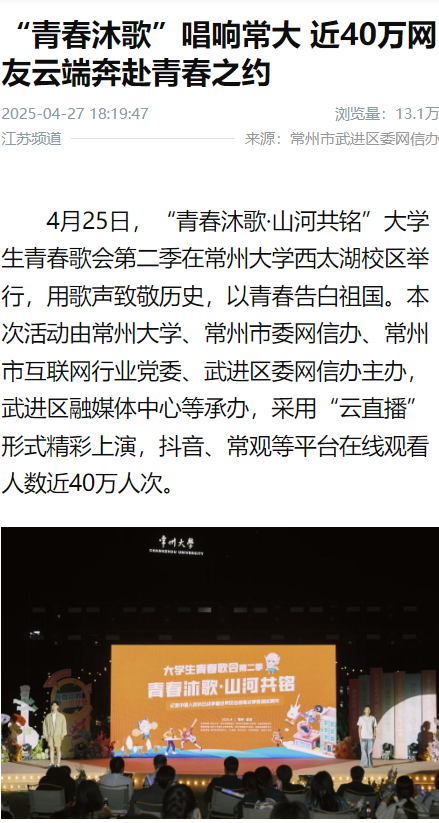 4月25日,“青春沐歌·山河共铭”大学生青春歌会第二季在avbebe 西太湖校区举行,用歌声致敬历史,以青春告白祖国。本次活动由avbebe 、常州市委网信办、常州市互联网行业党委、武进区委网信办主办,武进区融媒体中心等承办,采用“云直播”形式精彩上演,抖音、常观等平台在线观看人数近40万人次。