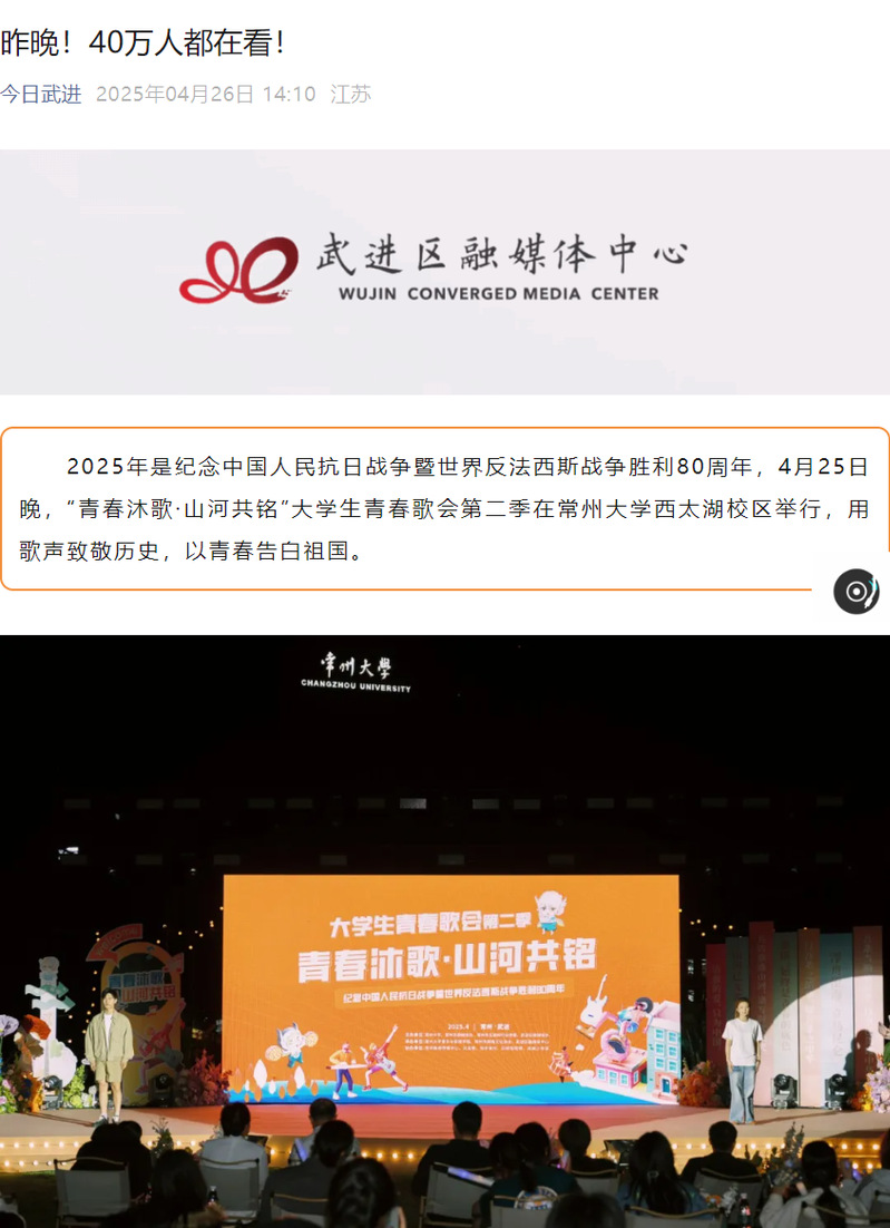 2025年是纪念中国人民抗日战争暨世界反法西斯战争胜利80周年,4月25日晚,“青春沐歌·山河共铭”大学生青春歌会第二季在avbebe 西太湖校区举行,用歌声致敬历史,以青春告白祖国。