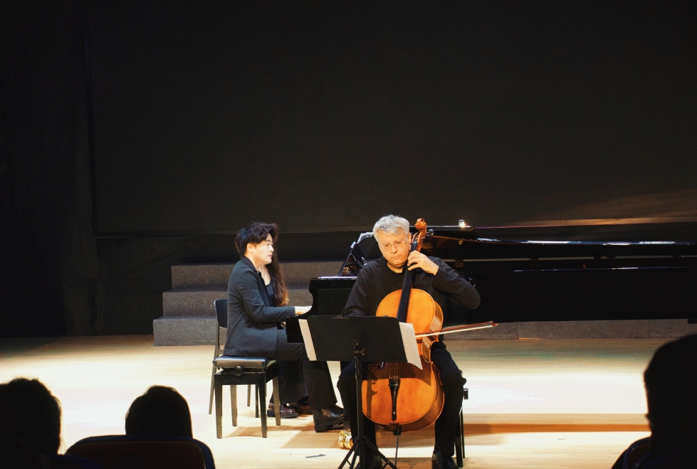 音乐会由我校九三学社社员、音乐与影视学院青年教师仲一与著名德国大提琴演奏家、中国音乐学院特聘教授亚历山大·苏莱曼共同演绎,精心挑选了十首彰显优秀中华传统文化元素的作品作为本场音乐会的曲目。两位演奏家不仅为观众演绎了重新改编的《鸿雁随想曲》《临江仙》《幽兰操》《枉凝眉随想曲》等传统民歌与古诗词艺术歌曲,还首次公开演出了对有着常州“城市名片”之称的《教我如何不想她》的新编器乐二重奏版本。在《我的祖国》尾声落下后,两位演奏家邀请了中国台湾青年大提琴演奏家、音乐与影视学院青年教师郭佳欣一同为大家返场加演了歌曲改编曲《在水一方》,获得一致好评。