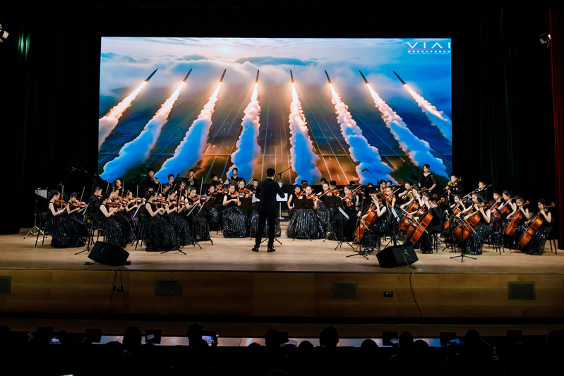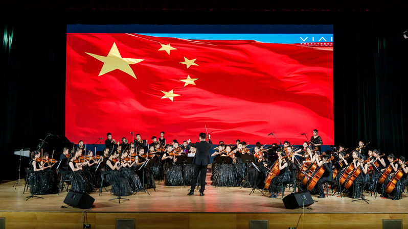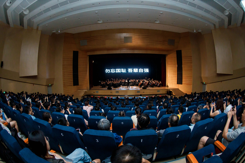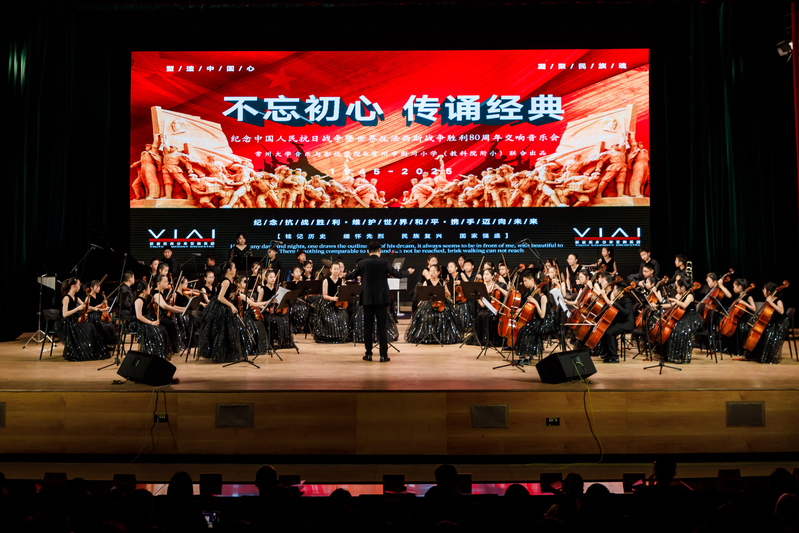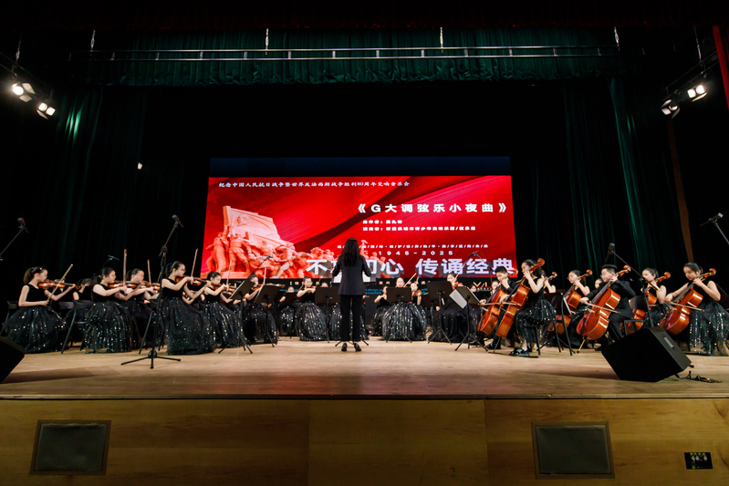 音乐会在《钢铁洪流》激昂的旋律中开场,将观众带入了那个烽火连天的年代。紧接着,《荒原骑兵》以紧凑节奏勾勒战斗场景,仿佛重现骑兵冲锋陷阵的飒爽英姿;《就是哪吒》传递无畏勇气,正如抗战中无数志士“明知山有虎,偏向虎山行” 的决绝;《Hand Clap》《铁血丹心》《世界赠与我的》等曲目,或轻快或激昂,用音符诉说着各种情感;《海阔天空》巧妙地融合了经典元素,大学生与小学生的完美配合,演绎出别样的热血激情;《G大调弦乐小夜曲》《第九交响曲》展现交响魅力,恰似抗战胜利后,人们对和平与美好的憧憬在旋律中流淌;《金蛇狂舞》《灯火里的中国》融入多种乐器与演唱,大学生与小学生再次携手,洋溢着浓厚的家国情怀;最终章由我校汪啸怡和黄靖博两位老师演绎的《不忘初心》,凝聚了对历史的深刻记忆与对未来的美好憧憬,全场观众沉浸在音乐营造的历史氛围中,重温民族的记忆,汲取前进的力量。