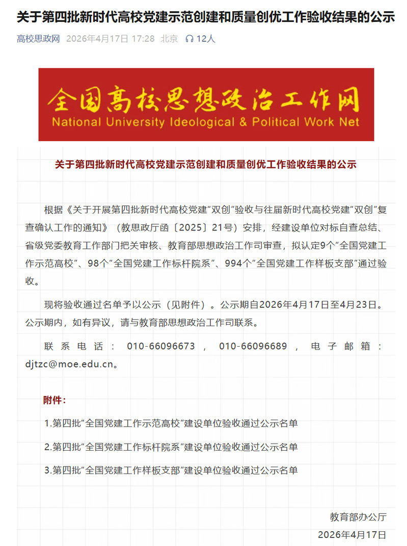 近日,教育部思想政治工作司公布第四批新时代高校党建示范创建和质量创优工作验收结果。根据《关于开展第四批新时代高校党建“双创”验收与往届新时代高校党建“双创”复查确认工作的通知》(教思政厅函〔2025〕21号)安排,经对标自查总结、省级党委教育工作部门把关审核、教育部思想政治工作司审查,avbebe 师生党支部顺利通过验收。